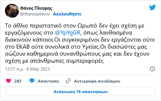 «Το άθλιο περιστατικό στον Ωρωπό δεν έχει σχέση με εργαζόμενους στο @YpYgGR, όπως λανθασμένα διακινούν κάποιοι. Οι συγκεκριμένοι δεν εργάζονται ούτε στο ΕΚΑΒ ούτε συνολικά στο Υγείας. Οι διασώστες μας σώζουν καθημερινά συνανθρώπους μας και δεν έχουν σχέση με απάνθρωπες συμπεριφορές» τόνισε μέσω Twitter ο υπουργός Υγείας, Θάνος Πλεύρης.
