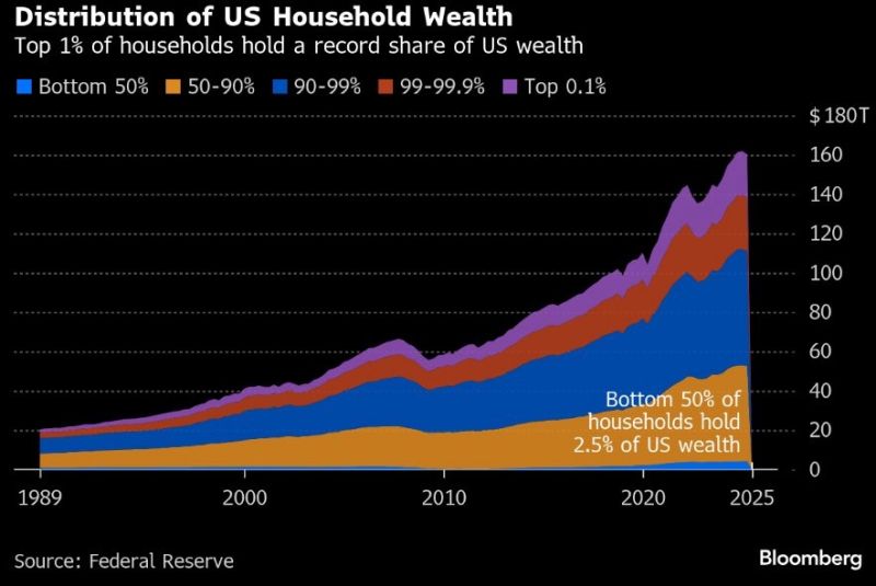 Ωστόσο, η κορυφή είδε τη μεγαλύτερα κέρδη: το κορυφαίο 1% αύξησε τον πλούτο του κατά 4 τρισ. δολάρια (+7%), φτάνοντας σε ιστορικό ρεκόρ τα 52 τρισ. δολάρια.