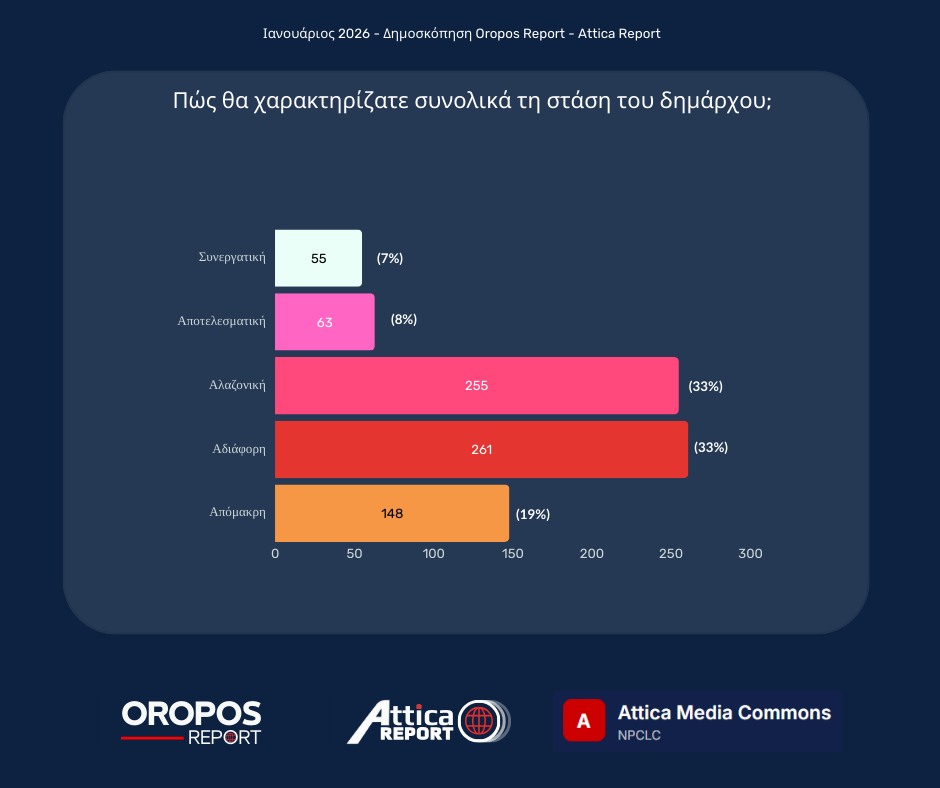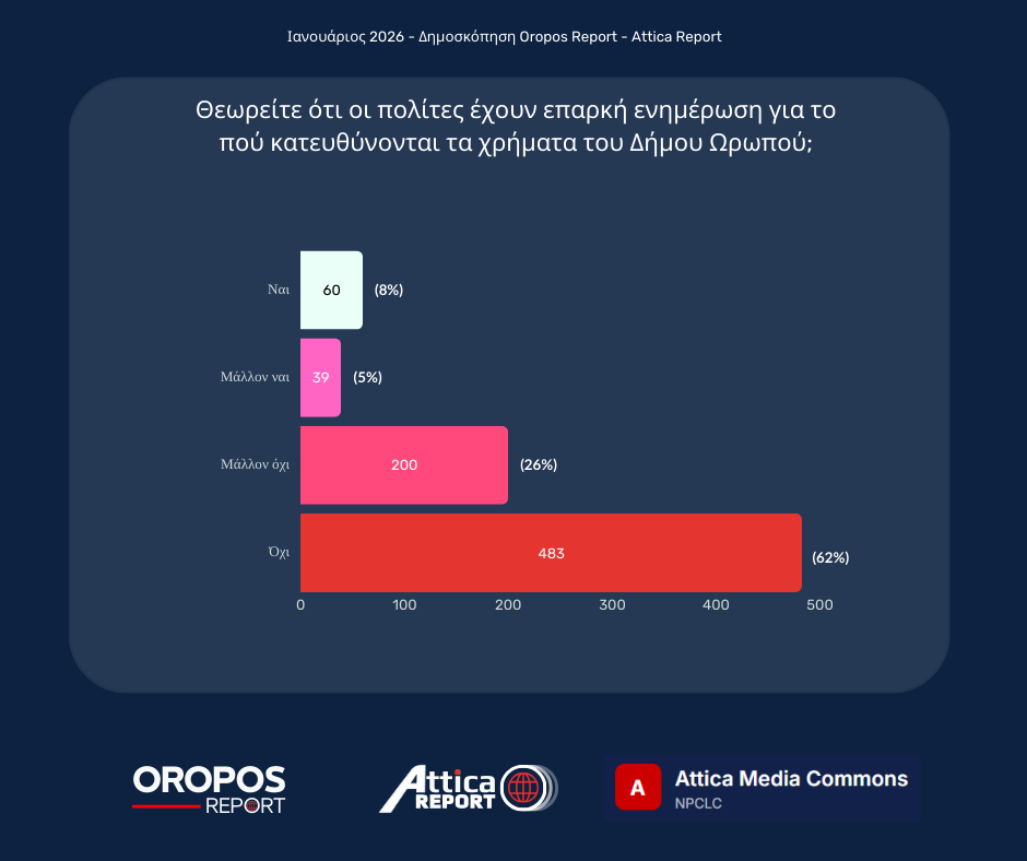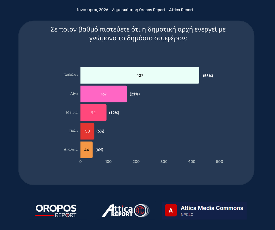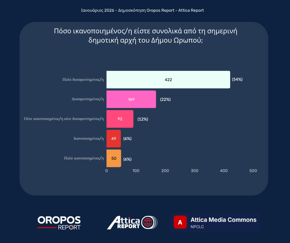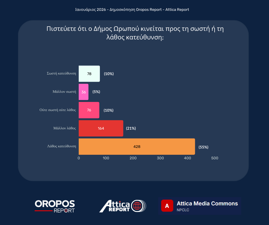 Το Oropos Report συνεχίζει σήμερα την παρουσίαση των αποτελεσμάτων της μεγάλης έρευνας που διεξήχθη τον Ιανουάριο του 2026, με τη συμμετοχή 782 δημοτών.