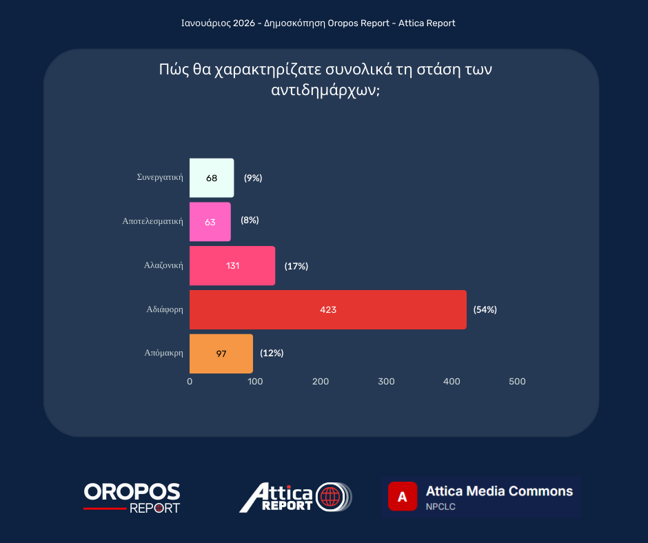 - Για τους Αντιδημάρχους: Η πλειοψηφία των πολιτών (54%) χαρακτηρίζει τη στάση τους ως «Αδιάφορη», ενώ η αποτελεσματικότητά τους αναγνωρίζεται μόλις από το 8%.