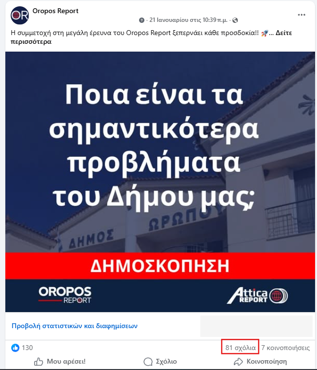 - Πρώτον, για πρώτη φορά σε τοπικό μέσο του Ωρωπού, περισσότερα από 400 επώνυμα σχόλια πολιτών κατέκλυσαν τις σελίδες των κοινωνικών μας δικτύων (Facebook – Instagram), καταθέτοντας με παρρησία την άποψή τους για τα χρόνια προβλήματα του δήμου και τη στάση της διοίκησης. Η επώνυμη αυτή τοποθέτηση αποτελεί την πιο ζωντανή απόδειξη ότι η κοινωνία δεν φοβάται πλέον να μιλήσει και ότι οποιαδήποτε προσπάθεια υποβάθμισης της εγκυρότητας ή της σκοπιμότητας της έρευνας του Oropos Report, αποτελεί στρουθοκαμηλισμό και άρνηση της πραγματικότητας.
