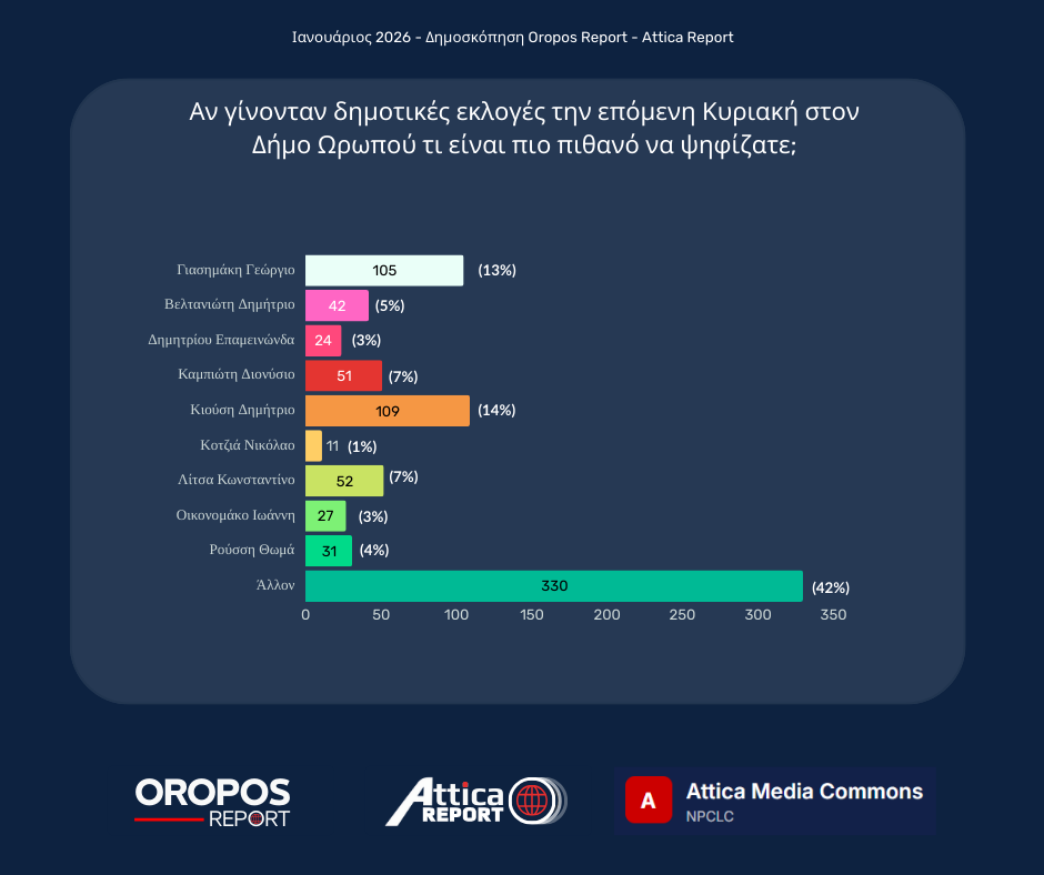 Την ίδια στιγμή, το εκκωφαντικό 42% που επιλέγει την επιλογή «Άλλον», στέλνει ένα ξεκάθαρο μήνυμα: Η κοινωνία του Ωρωπού έχει ήδη προσπεράσει το σημερινό μοντέλο διοίκησης και αναζητά μια νέα, καθαρή και αποτελεσματική πρόταση.